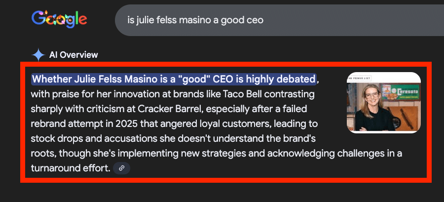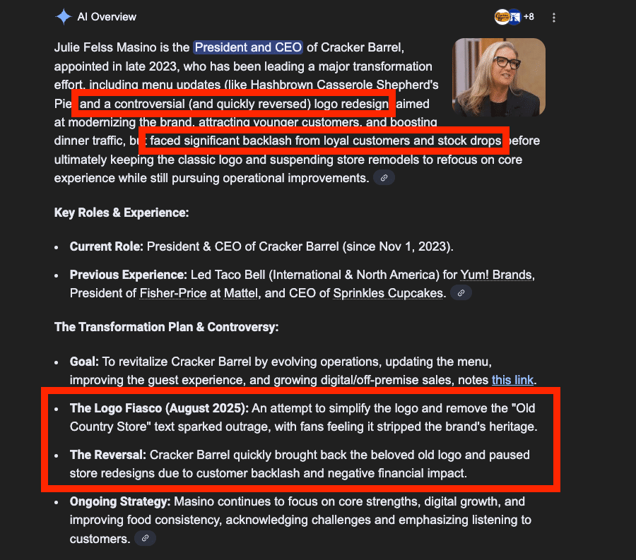 The AI Overview doesn’t just mention the controversy as a misstep. It frames the crisis as a strategic failure that questions Ms. Masino’s understanding of the brand’s roots, which is core to her role as CEO.