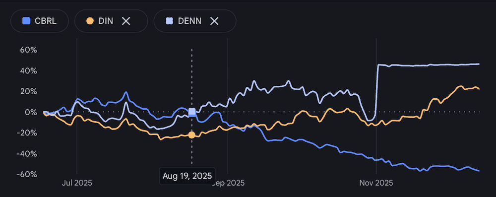 - CBRL stock price is down 55% since the logo announcement, resulting in $594 million in lost market capitalization. During the same period, competitors saw gains: Denny’s Corp stock was up 31% and Dine Brands Global (iHOP parent) was up 36%.
