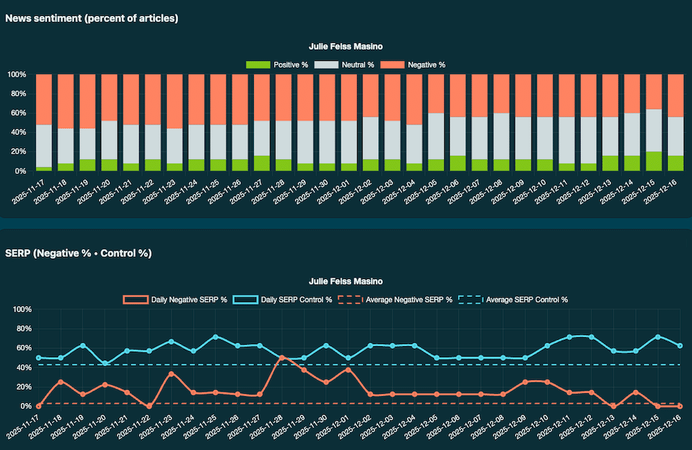 Ms. Masino has endured more than 50 days of negative sentiment in her page-one organic search results, with some days exceeding 30% unfavorable sentiment. The crisis is visible across most page-one Google search features, including her Knowledge Graph Carousel, “what people are saying” section, videos carousel, and multiple organic search listings.
