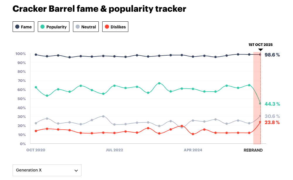 - 38% of consumers now have a negative view of Cracker Barrel.