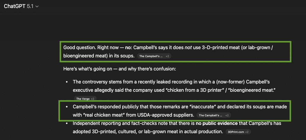 Headlines about 3D-printed meat sparked a surge in consumer search interest for topics like “Campbell’s meat,” “bioengineered meat,” and “3D printed meat,” according to Google Trends data. But as consumers sought clarity, generative AI surfaced even more unfavorable information.