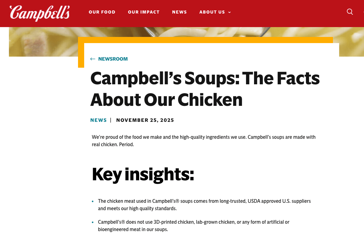 The page clearly states that the reporting was false and clarifies the correct ingredient sourcing for Campbell’s Soups. The page is clean, simple, and well-structured using an FAQ format which can help influence how Google and LLMs understand and present the story to consumers.