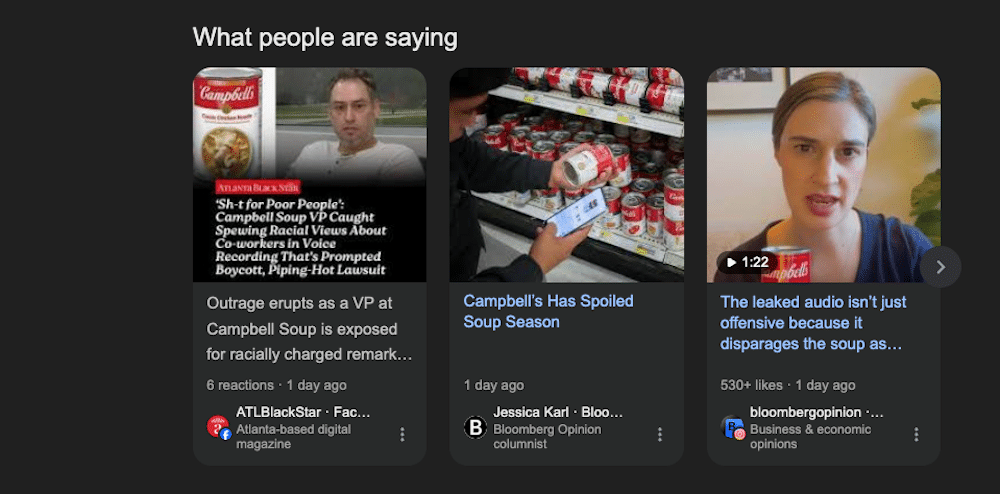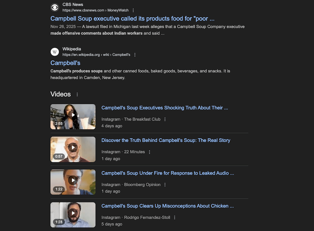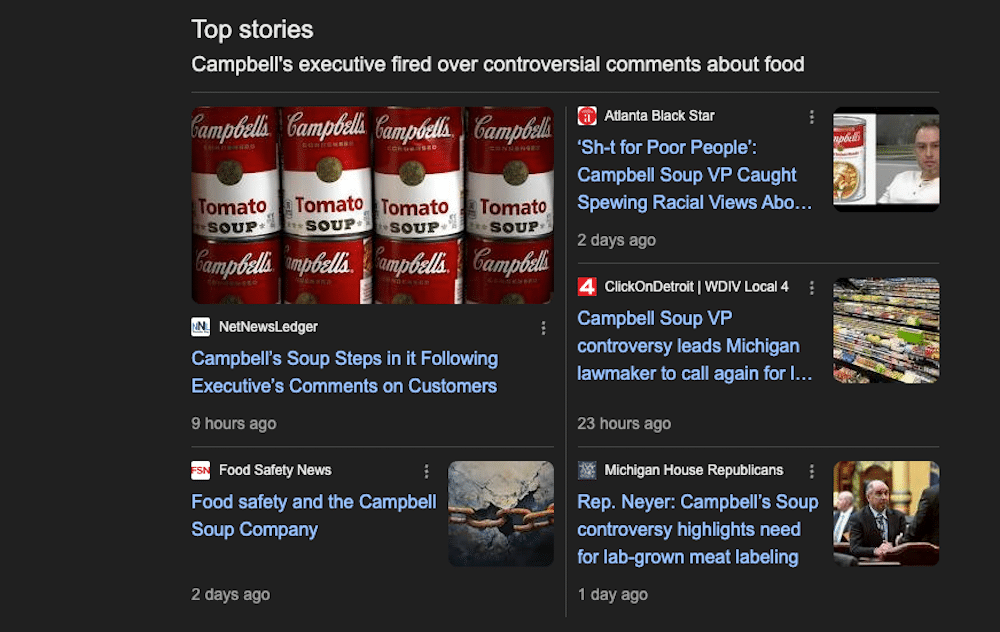Within 24 hours, the flood of negative headlines even overtook Campbell’s page-one organic search results.