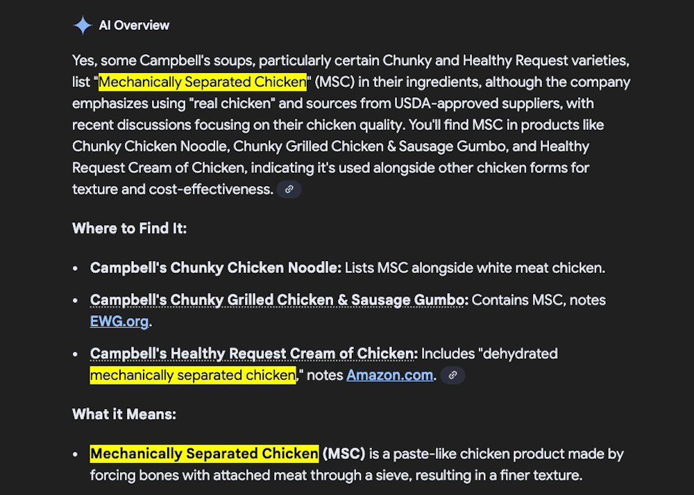 Google’s AI Overviews confirmed the ingredient and offered more information about it. Although MSC is FDA approved, and technically it’s “real chicken,” it’s not a favorable narrative for Campbell’s.