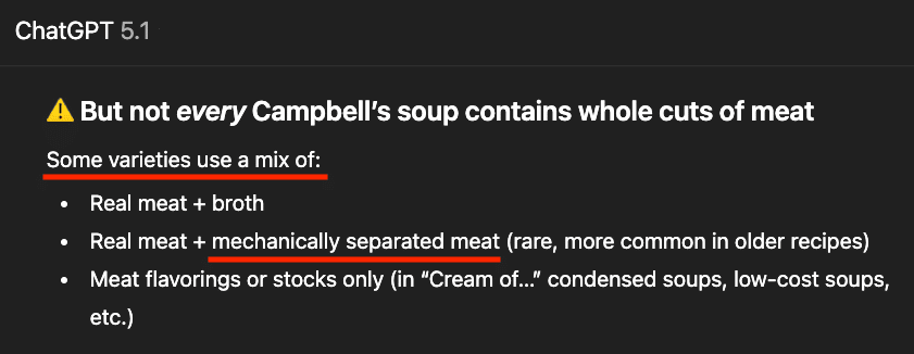 To make sure that wasn’t a hallucination, I asked, “Does Campbell’s Soup use real meat?” And ChatGPT doubled down on the claim that “Some varieties use a mix of real meat and mechanically separated meat.”